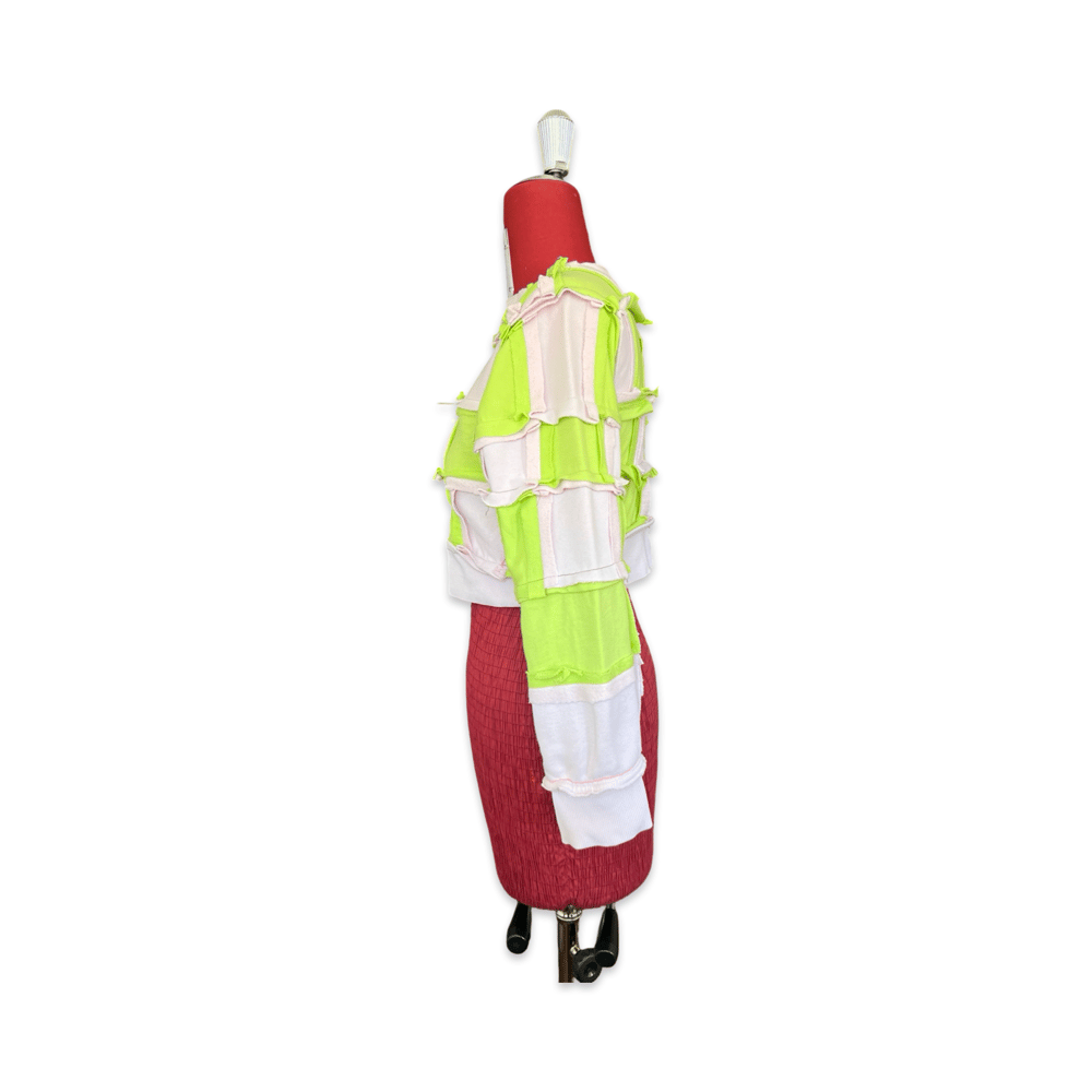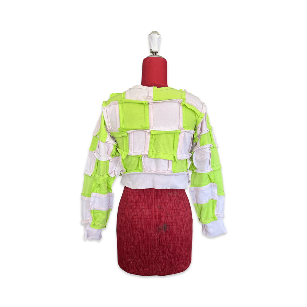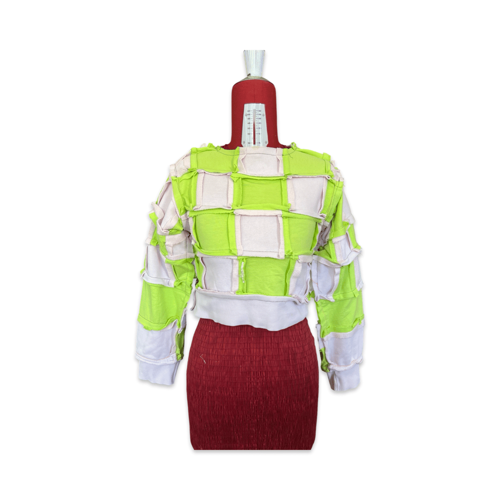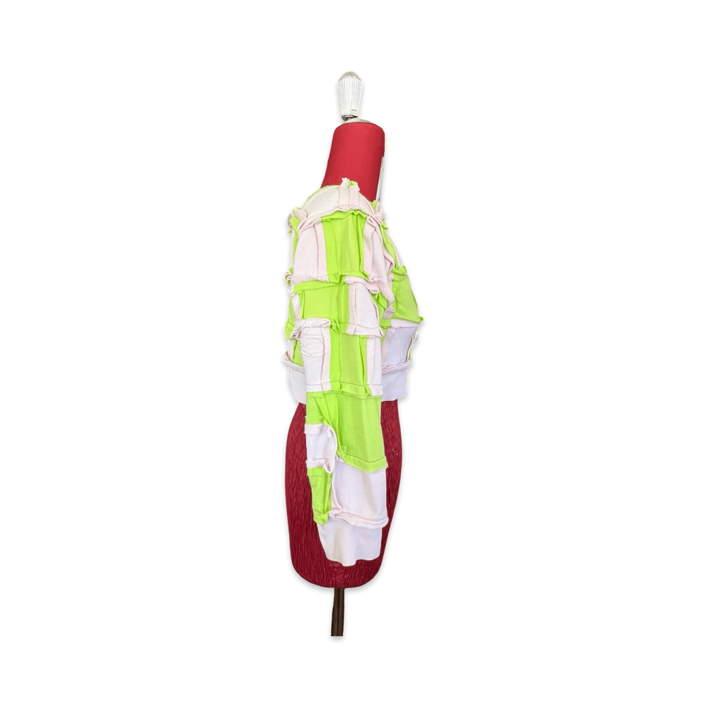 This experimental piece was created through a modular reconstruction technique using reclaimed knit garments in lime green and soft neutral tones.