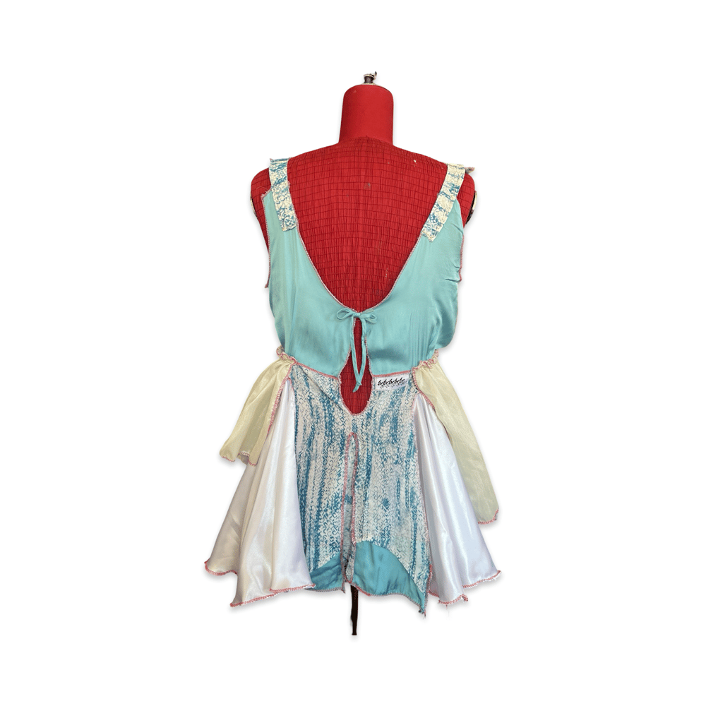 This delicate piece was created from reclaimed garments in soft sky-blue and ivory tones. The upper section features a fluid draped bodice with adjustable ties, while the lower part is constructed from layered panels of different textures and fabrics.