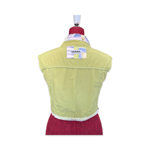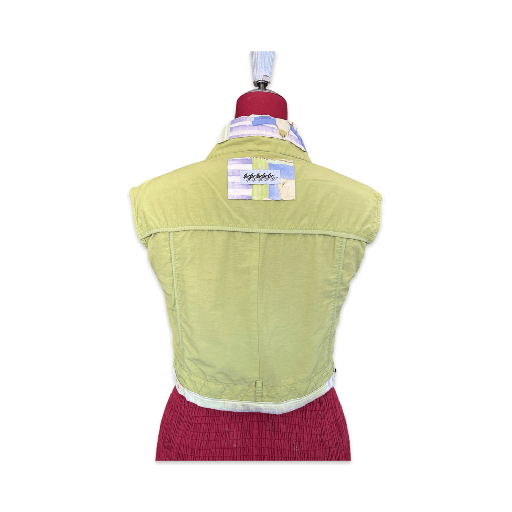 This playful garment combines reclaimed fabrics in soft lime tones with unexpected vintage prints. The central panel and inner collar reveal a nostalgic teddy bear textile that contrasts with the utilitarian structure of the vest.